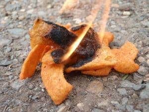 Corn chips are loaded with, chemicals, oils, and flavors making it a perfect fire starter. Just touch your lighter or match to the edge and you will start a nice solid lasting flame. Bonus you can make a nice skillet of campfire nachos (NOTE we can hyperink the campfire nacho article ) with the rest of the bag.